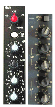 Equalizer: hf hoge freqentie regeling ,mid in dit geval semi parametrische middenregelaar(een knop bepaalt de frequentie waarop de tweede regelaar invloed heeft). Bij een echte parametrische regelaar is er nóg een knop, die dan de breedte van het werkgebied ook nog kan instellen maar je komt ook hmid lmid tegen de hoge/laag mid regeling , lf lage freqentie