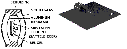 het piezoelektrisch effect. Materialen die aan dit effect onderhevig zijn zullen mechanische spanningen omzetten in elektrische spanningen. In de constructie van BOVENSTAANDE figuur is een piezoceramisch plaatje ingeklemd tussen twee aluminium membranen. De drukverschillen in de lucht brengen de membranen aan het trillen, deze trillingen worden overgedragen op het plaatje. Als gevolg van het piezoelektrisch effect zal er over het plaatje een spanning ontstaan.